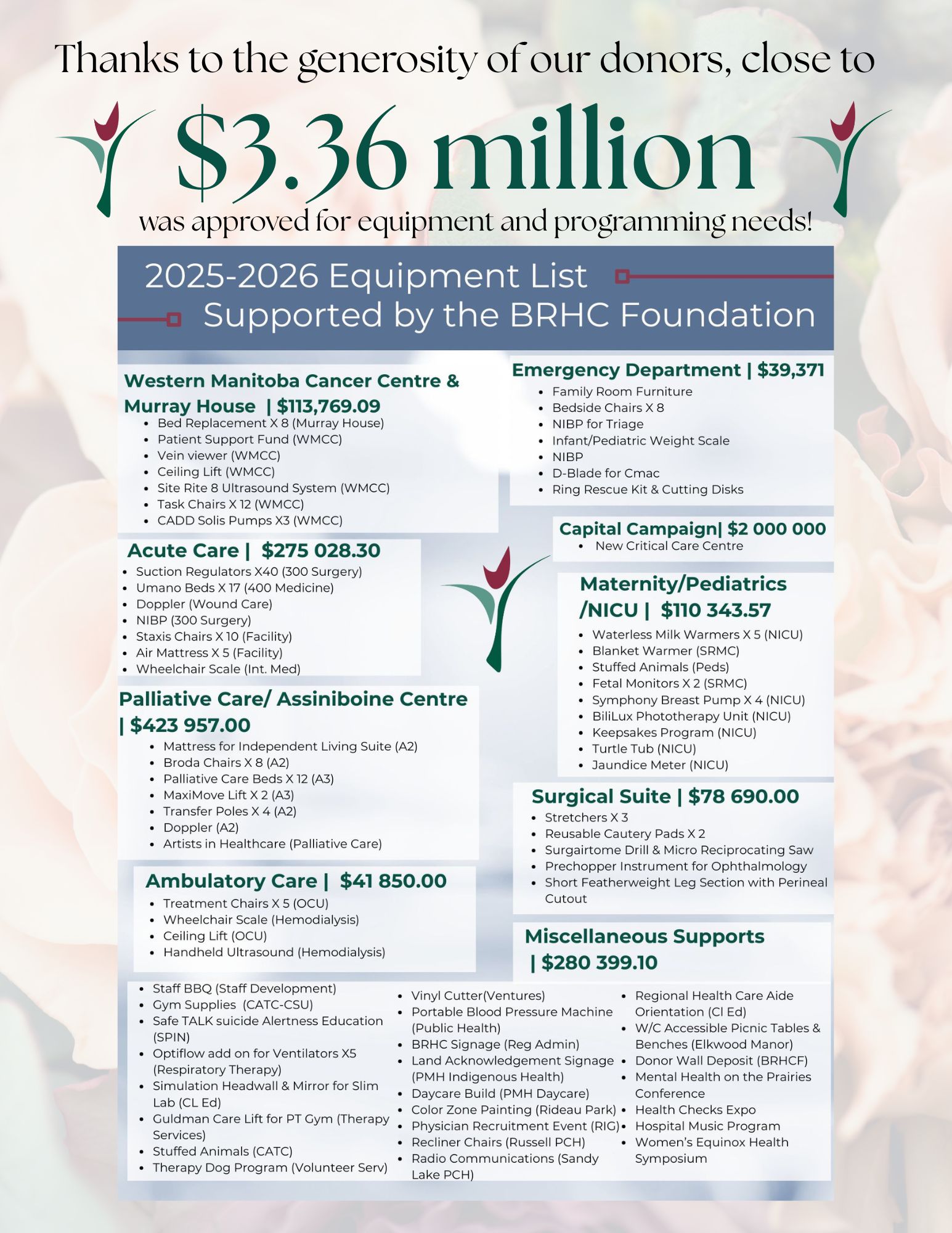 Thanks to the generosity of our donors and grant process, we were able to provide close to $3.36 MILLION in equipment and program support to the Brandon Regional Health Centre in the 2025-2026 fiscal year.